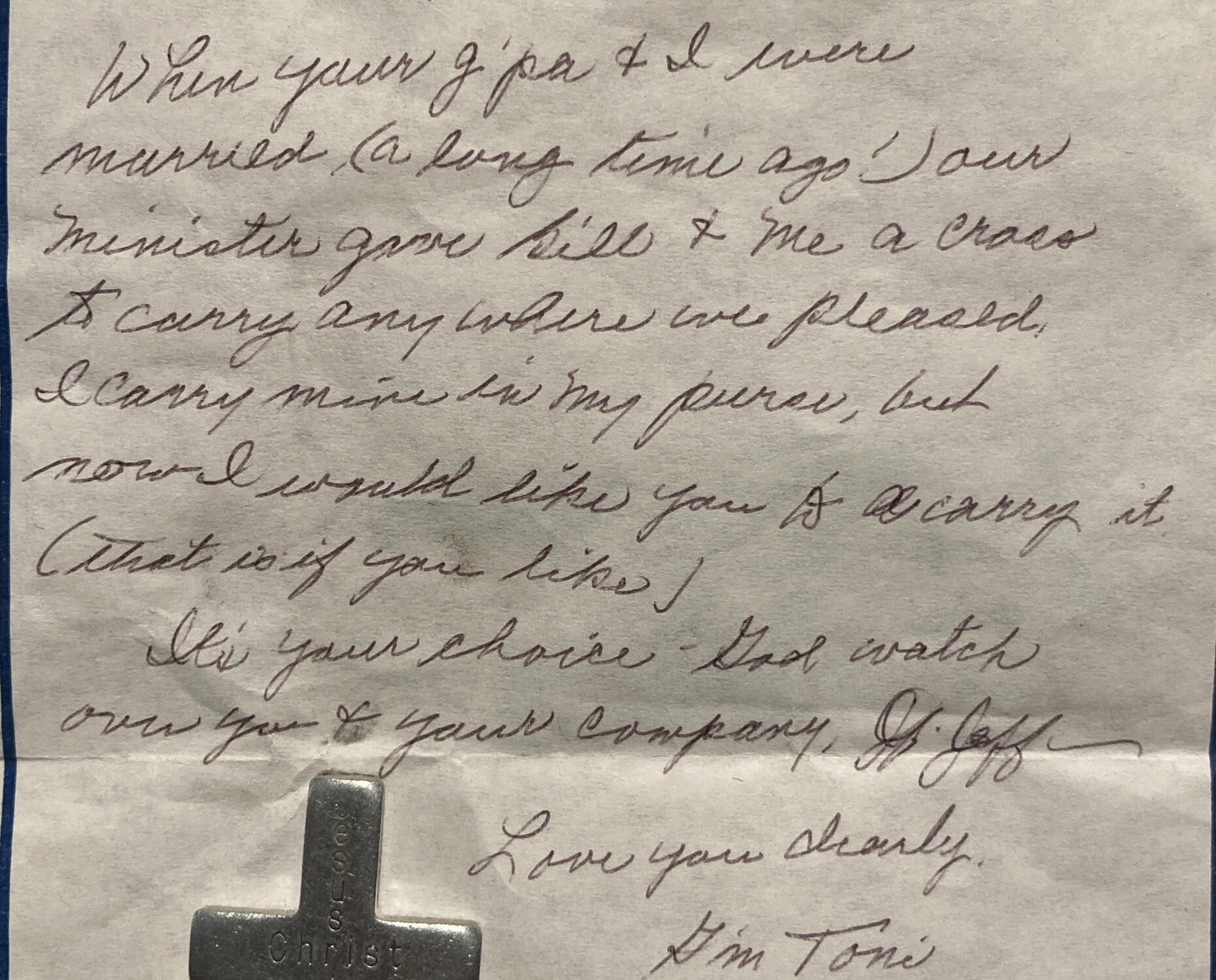 About the cross: When your G’Pa and I were married a long time ago, our minister gave Bill and me a cross to carry anywhere we pleased. I carry mine in my purse, but now I would like you to carry it. God watch over you and your company.